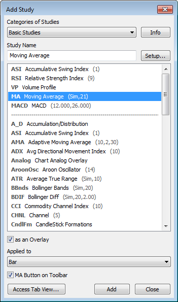 •click the Studies button on the chart toolbar to open the Manage and Add Studies window, click the study, then click Add