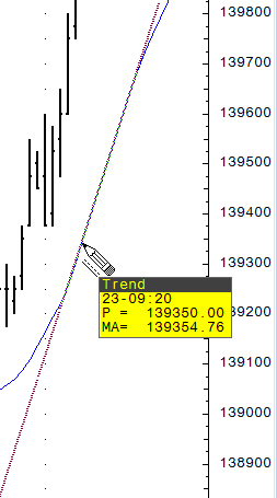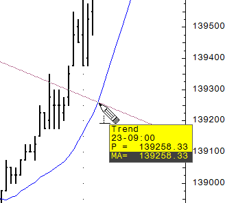 Draws trend and trend channel lines parallel to another tool or study. (Trend and trend channel lines can “snap” to other tools and studies.) For example, this image shows a parallel trend line snapping to a moving average curve. Notice the change in the cursor: |