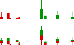 Fisher bars inherit their color from the corresponding brick. Total volume is displayed in one color, either up or down. Bid/ask volumes are drawn in two colors, both up (ask) and down (bid). For bid/ask volume, see also the Display Volume, Stacked parameter.