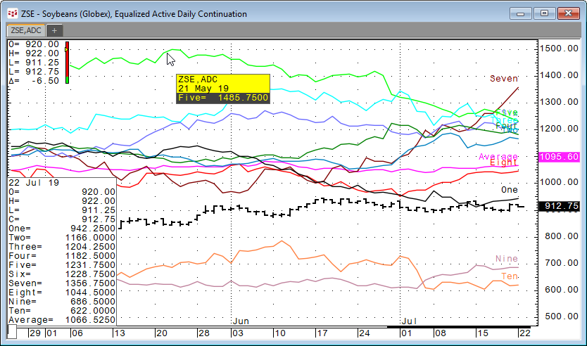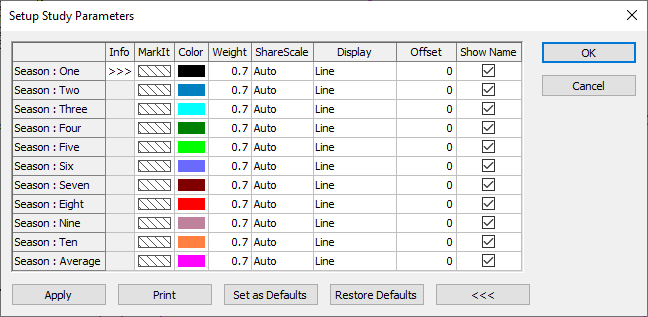 When added to the daily continuation bar chart the Season study will pull in the previous ten individual years of bar data. You can use daily continuation or active daily continuation.