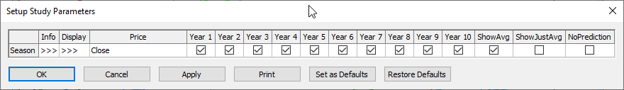 The preferences allows you to select which years you want displayed. You can select using a market data parameter other than close, such as HLC/3. You can choose to display an average of the years selected, or just the average. If the NoPrediction parameter is unchecked you can drag the chart to left and see how the previous years’ data moved looking forward.